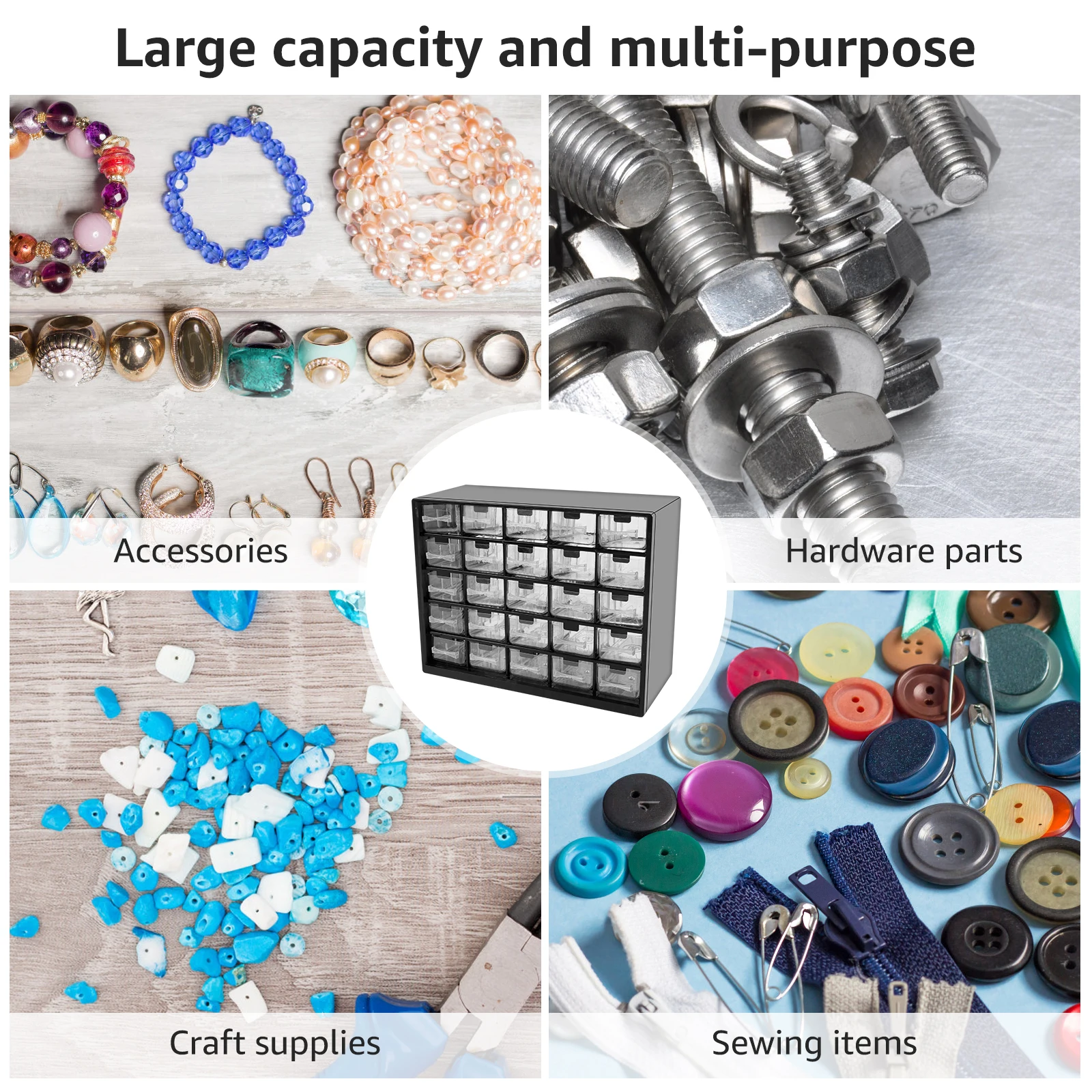 Wide Application This desktop storage box comes with 25 drawers. which can be sorted to store small stationery. cosmetics. office supplies. sewing supplies. crafts. jewelry. beads. hardware parts. ornaments or fishing gear. Keep your room neat and organized. say goodbye to clutter.