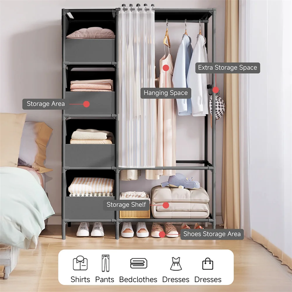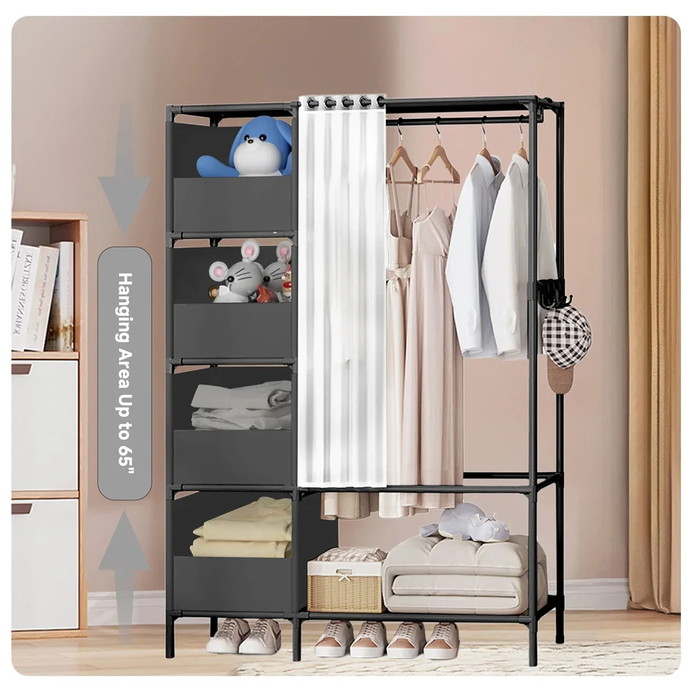 This clothes rack provides semi-open storage space for your clothes. with multiple storage areas and dust curtains. making it easier for you to select clothes and store items.