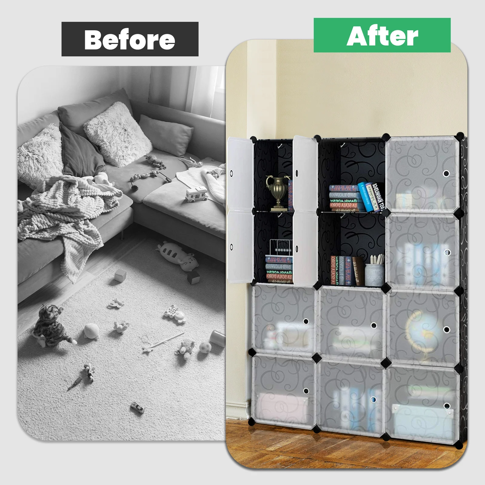 Store children’s messy toys? Keep your books or magazines? This plastic organizer can do all these jobs. This 12 cubes Portable Closet Storage Cabinet is an amazing item to keep your clothes. books. toys. and shoes neatly organized. The heavy-duty and sturdy cabinet is lightweight so that you can move anywhere you like. And you can organize these cubes as your wish to suit the space. No odor and not easy to deform. they are versatile and can be layered for storage and classification. Suitable for all indoor places. bedroom. bathroom. kitchen. study. It can perfectly organize all items.